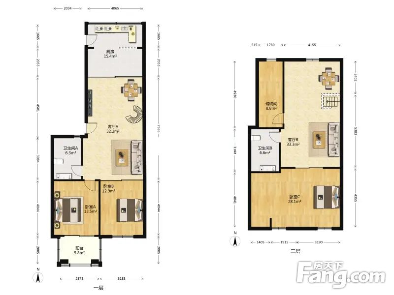 户型介绍房子楼下双南向卧室采光很好,北面厨房比原始多了十几个平房,可以做中西厨。楼上三个卧室,可以做儿童书房,游戏房等